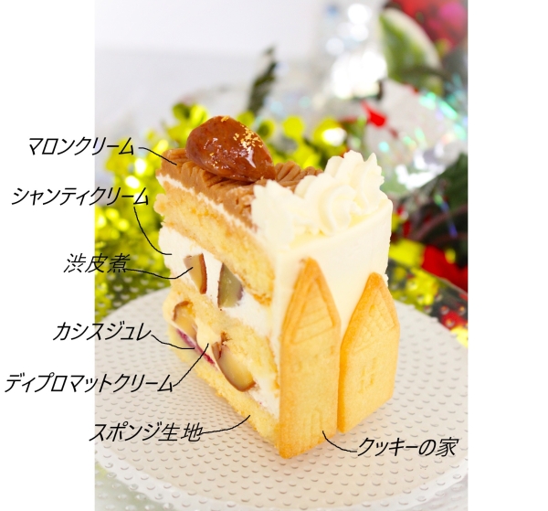 ふっくらしっとりのスポンジ生地の中は渋皮煮やジュレ、そして2種類のクリームをサンドした美味しいハーモニーとなります。
